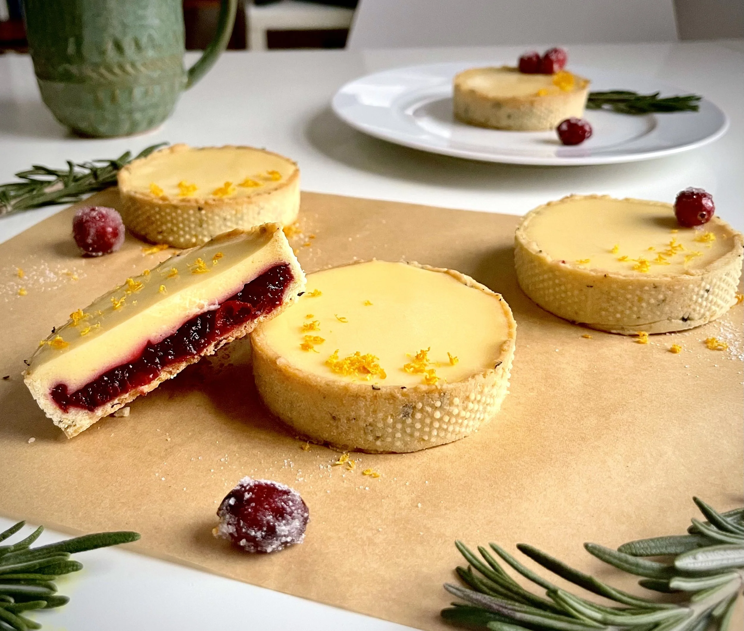 The tart shell is a pate sable tart crust, with rosemary-butter and orange zest. The bottom layer inside is a cranberry orange jam, topped with an orange curd. If you’re making all of these elements, I have listed them in order of how they should be done to allow for cooling/setting.